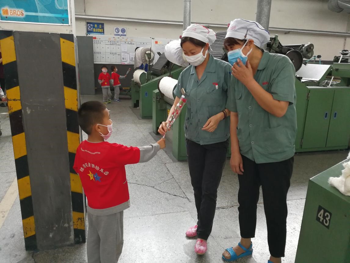 ▲2017年5月5日,企业所在社区宁波高新区贵驷幼儿园小朋友参观工厂,并向劳动者献上了亲手制作的花朵、卡片等小礼物。