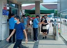 图为:员工上班自觉接受测温、亮码、戴口罩检查