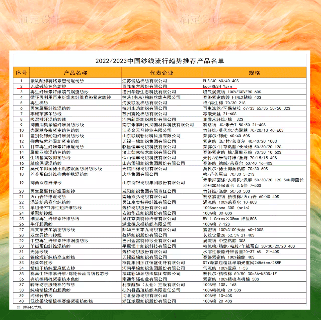 百隆东方的EcoFRESH Yarn®(无盐碱染色色纺纱)入围 2022/2023中国纱线流行趋势推荐产品名单。这是中国棉纺行业协会结合中国纤维流行趋势,秉承创新·绿色·低碳·环保·时尚理念,由业内权威专家从工艺技术、时尚文化、市场竞争、品牌文化等多角度评选出设计合理、性能优异、市场适用性强的产品。