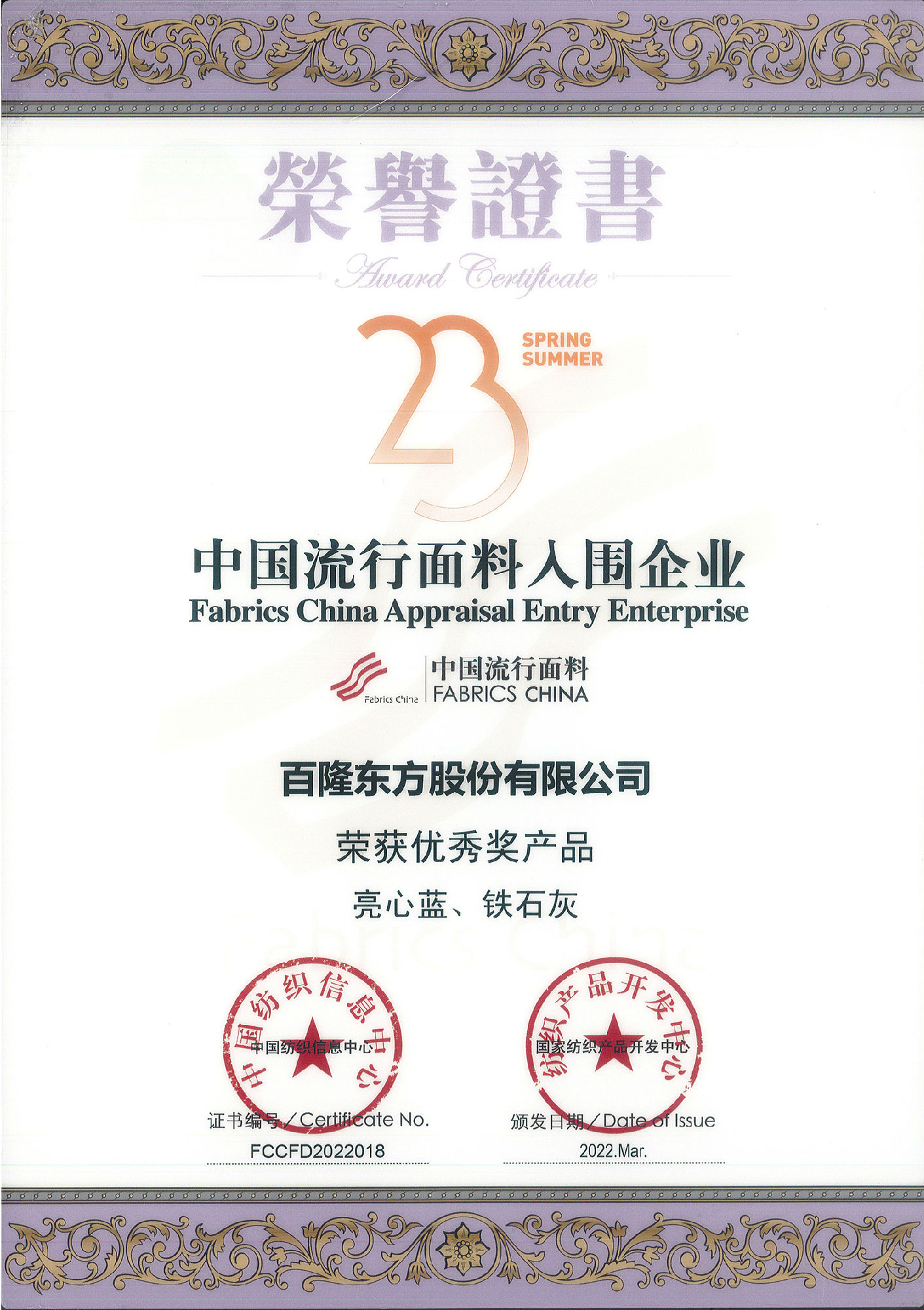 中国流行面料入围评审是彰显纺织行业开发成果的重要活动,是优秀纺织企业展现研发实力的重要平台。多年来,百隆东方加强研发中心自身建设,强化产学研合作,深化科研攻关,一直是中国流行面料评审的入围企业。